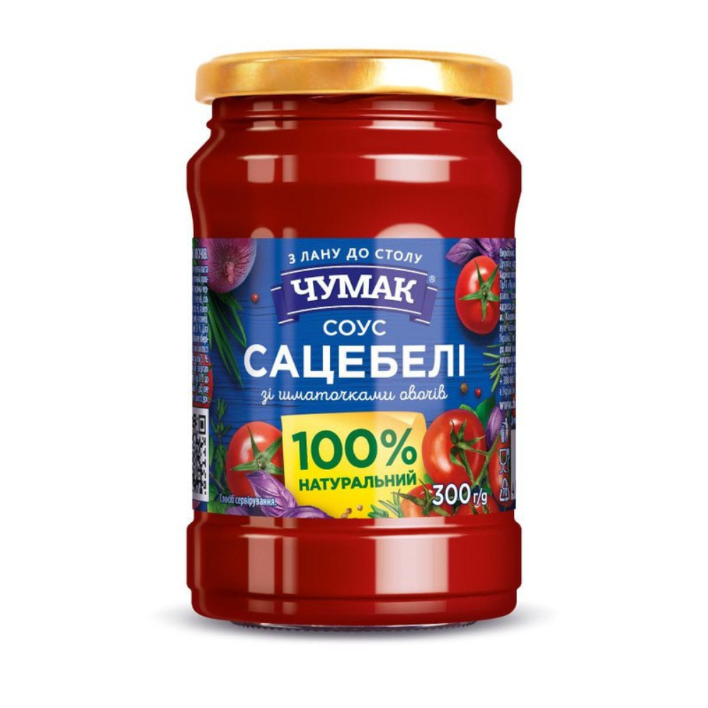 Ingredients: drinking water, tomato paste (87 g tomatoes per 100 g sauce), sugar, acidity regulator: acetic acid (spirit vinegar), corn starch, dried chopped vegetables 2.39% (red pepper, tomatoes, green pepper, onion, garlic, green onion), salt, spices (coriander, dill, chili, fenugreek, allspice, savory, oregano).