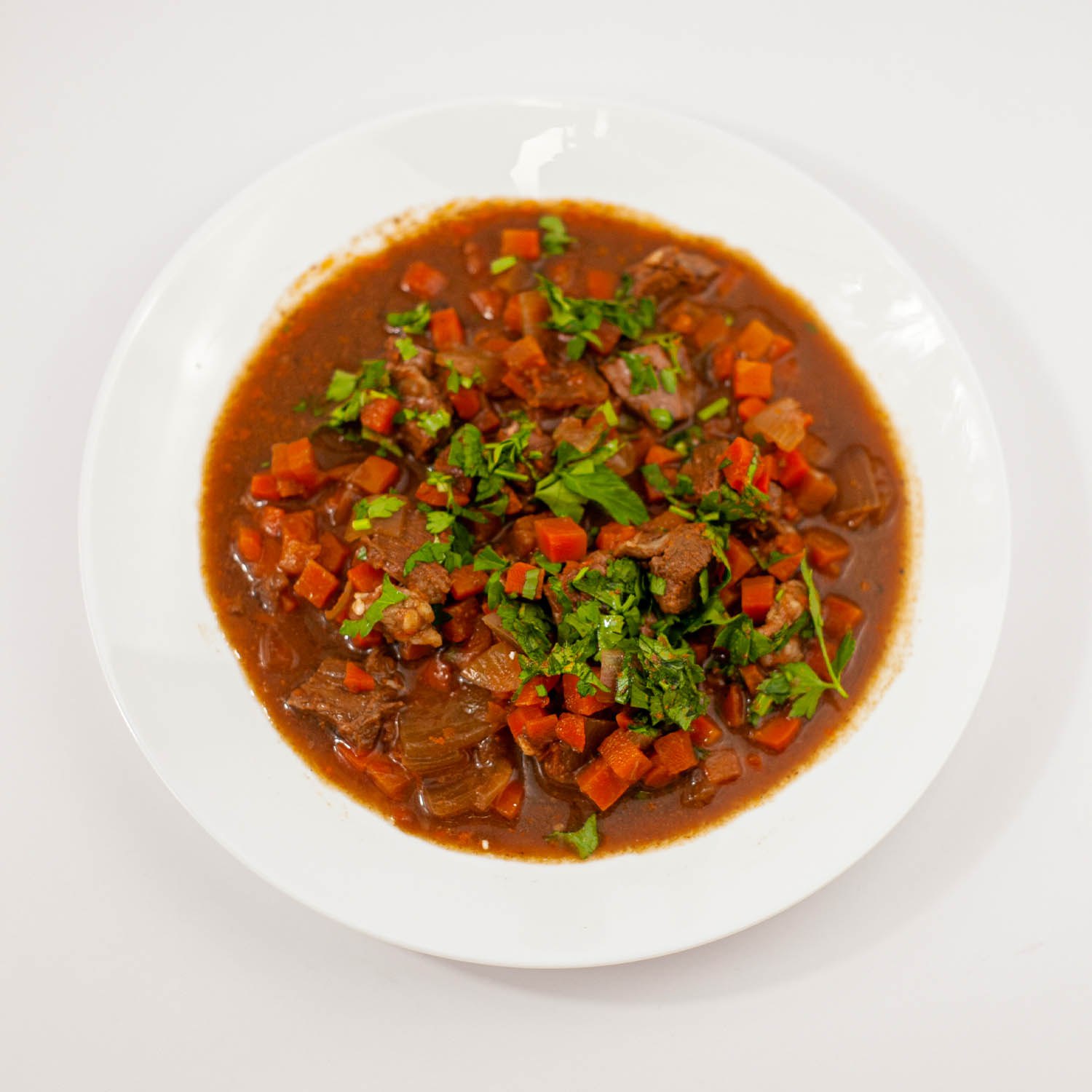 Говядина, морковь, лук, чеснок, помидоры, специи, зелень.
