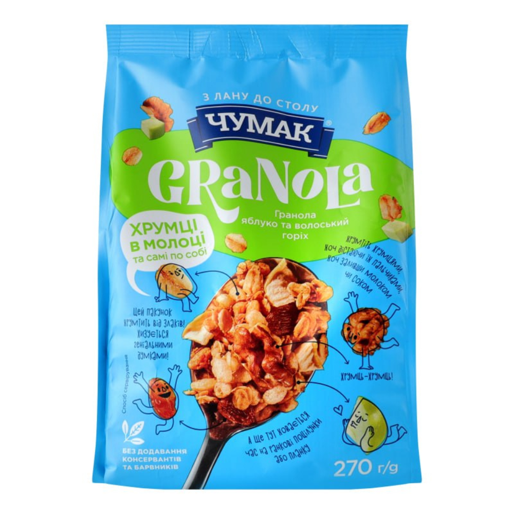 Состав: выпеченная смесь 89 % (цельнозерновые ОВСЯНЫЕ хлопья 53,4 %, сахар, кукурузные хлопья (кукурузная крупа, сахар, экстракт ЯЧМЕННОГО СОЛОДА, соль), пальмовый олеин, кокосовая стружка, рисовые зёрна (мука рисовая, мука ПШЕНИЧНАЯ, сахар, соль, разрыхлитель: гидрокарбонат натрия), мука ПШЕНИЧНАЯ, натуральный мёд 1,99 %, глюкоза, соль); начинка в переменном соотношении 11 % (изюм (сушёный виноград), сушёное яблоко 2 %, ядро ГРЕЦКОГО ОРЕХА 2 %).